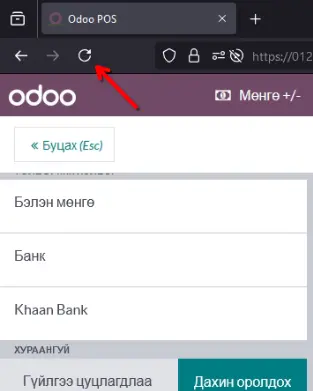 1. ПОС дэлгэц refresh хийх. Refresh хийх дээ browser-г `ctrl+r` дарах эсхүл дэлгэцийн зүүн дээд булан дах дугуй хэлбэртэй дүрс дээр даран дахин ачааллах боломжтой.