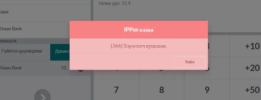 2. ПОС дэлгэц дээрх тухайн төлбөрийн хүсэлт идэвхтэй хайх хугацааг дуусах хүртэл хүлээх. Өөрөөр хэлбэл дэлгэцэд [366] Хэрэглэгч цуцалсан гэсэн дэлгэц гарч ирэх үед Тийм товч дээр даран борлуулалт үргэлжлүүлэх.