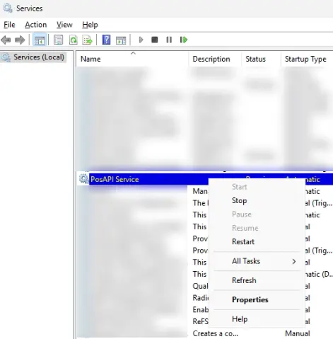 3. PosAPI гэдэг дээр mouse2 даран гарч ирэх цэсээс хэрэв Start гэдэг нь идэвхтэй бол дарна. Мөн restart гэдгийг дарах боломжтой.